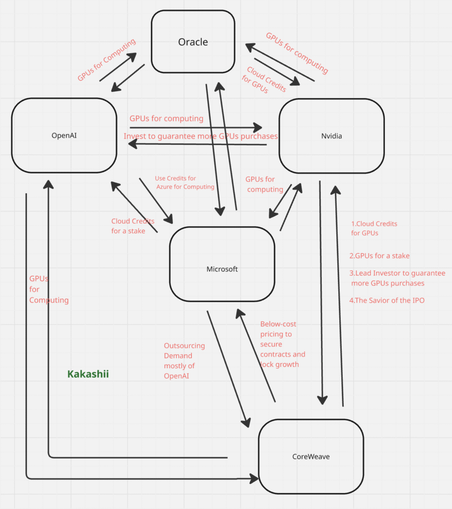 Ve sonra birbirine para akıtmak üzerine kurulan saadet zincirini görüyorsunuz: OpenAI Nvidia’ya para veriyor, Nvidia Oracle’a, Microsoft herkese. Para aynı sirkülasyonda dönmeye devam ediyor. Metinle yazınca saçma görünüyor ama resme bakınca kral çıplak.